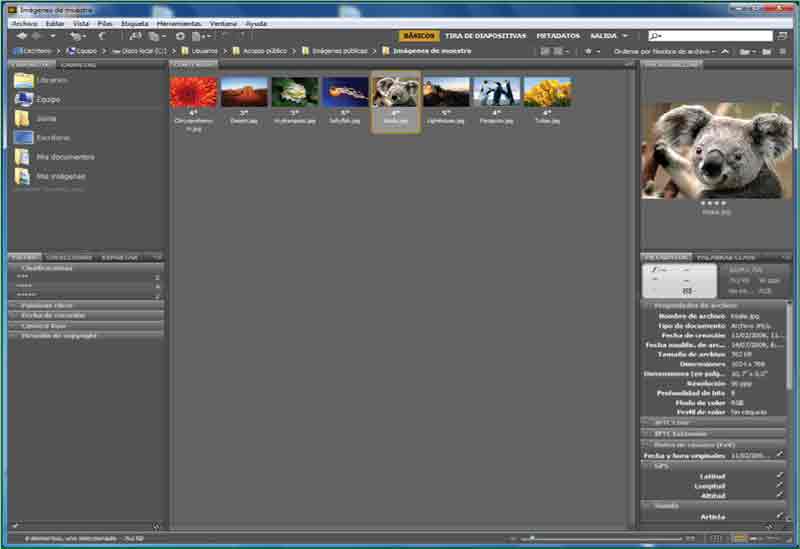 El explorador de archivos Adobe Bridge, incluido en el paquete de aplicaciones Creative Suite, permite organizar y controlar las imágenes contenidas en el equipo, así como manipularlas en distintos aspectos: cambios de orientación y de tamaño, manipulación del color, etc.