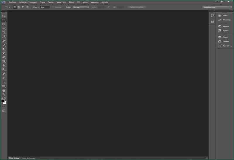 La interfaz de Photoshop CS6 ha sido simplificada para proporcionar más espacio a la zona de trabajo. En la parte superior de esta interfaz se encuentra la Barra de menús y debajo de ésta, la Barra de opciones de herramienta, la cual se adapta a la herramienta seleccionada en cada momento. En el extremo derecho de esta barra de opciones se encuentra el selector de espacios de trabajos, que permite adaptar la interfaz al tipo de trabajo que se esté realizando. Dispuesto verticalmente a la izquierda de la pantalla, se encuentra el panel Herramientas, que agrupa las herramientas para poder, entre otras muchas acciones, dibujar, colorear y seleccionar partes de una imagen. El resto de paneles aparecen en la parte derecha y pueden mostrarse u ocultarse así como distribuirse por el área de trabajo modificando su posición y tamaño. Como novedad en esta versión del programa, por defecto se muestran contraídos en la parte inferior del área de trabajo dos paneles: Mini Bridge y Línea de tiempo.