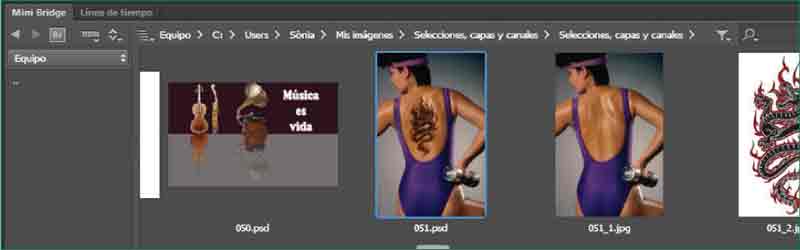 10 La imagen situada en primer plano es la última que se ha abierto y, por tanto, la última que ha sido seleccionada. Como puede comprobar, cada imagen ocupa una ventana encabezada por la pestaña que muestra nombre, zoom y modo de color. De esta forma es realmente sencillo pasar de unas a otras. Nos ocuparemos de la visualización de varios documentos en el área de trabajo del programa en una lección posterior de este mismo apartado. Otra forma de abrir imágenes en Photoshop es desde la aplicación Adobe Bridge, como vimos en la lección anterior. Como esta acción ya fue realizada en su momento, no queremos dejar pasar la oportunidad de mostrarle el funcionamiento del explorador de archivos mini, denominado precisamente Mini Bridge, para la apertura de archivos en Photoshop. El acceso a Mini Bridge se realiza en esta versión del programa desde el panel situado por defecto en la parte inferior del área de trabajo e implica la ejecución en segundo plano de Bridge. Pulse sobre la pestaña de dicho panel. (9)