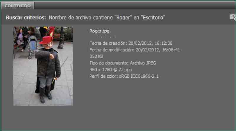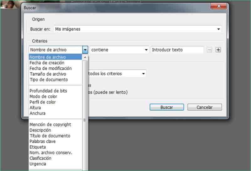 15 Efectivamente, puede realizar búsquedas por tamaño, fecha de creación, modo de color, mención de copyright, espacio de color, flash, y un largo etcétera. En este caso, mantenga las opciones Nombre de archivo y contiene en el apartado Criterios y escriba el término que desee en el campo Introducir texto. (13)