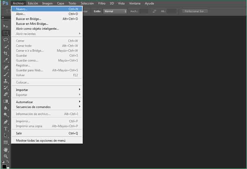 1 En el primer ejercicio de este nuevo apartado del libro, aprenderá diferentes modos de abrir un archivo con Adobe Photoshop. Al acceder al programa, el área de trabajo se muestra vacía. Para empezar a trabajar, y según sus necesidades, podemos crear un nuevo lienzo o bien abrir un archivo existente. En primer lugar le mostraremos cómo crear un lienzo en blanco. Despliegue el menú Archivo y seleccione la opción Nuevo. (1)