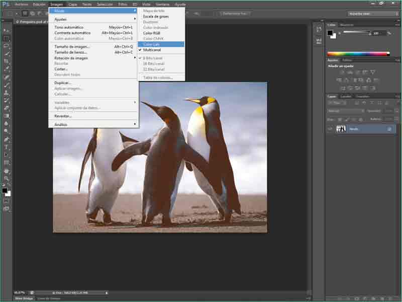 Los cambios de modo de color de las imágenes en Photoshop se llevan a cabo desde el menú Imagen, concretamente desde el comando Modo. Normalmente, las imágenes se encuentran en modo RGB.