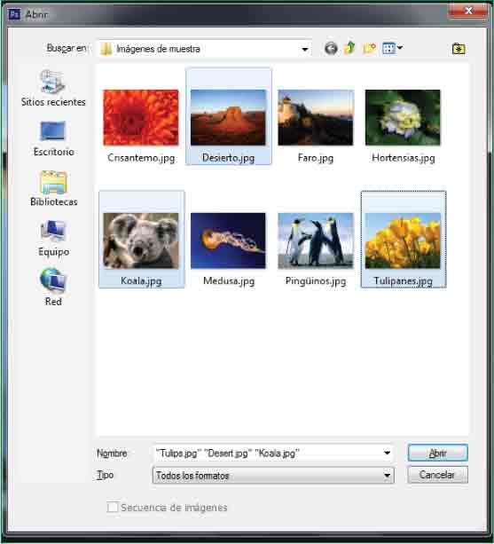 Si las imágenes que necesita seleccionar en el cuadro de diálogo Abrir se encuentran situadas consecutivamente, puede hacer clic en la primera y en la última mientras mantiene pulsada, en este caso, la tecla Mayúsculas.