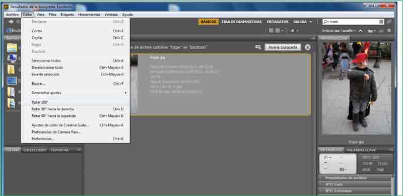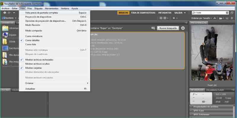 12 Bridge rastrea la ubicación especificada y da con la imagen que estábamos buscando. Si el archivo que necesita localizar no se encuentra en ninguna de las ubicaciones predeterminadas en el explorador, no se preocupe, puesto que la aplicación dispone de un comando de búsqueda alternativo. Para acceder a él, despliegue el menú Editar y haga clic sobre la comando Buscar.