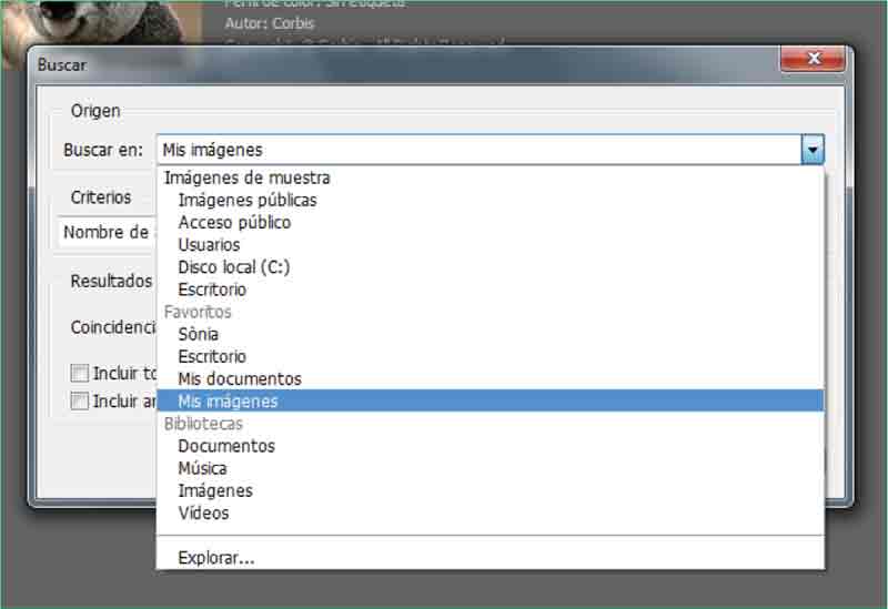 9 Una vez comprobada la utilidad del panel de filtros, localizaremos otra imagen utilizando ahora el campo de búsqueda del programa. Debe tener en cuenta que el uso de este campo restringe la búsqueda a una serie de ubicaciones del equipo. Para comprobarlo, haga clic sobre la punta de flecha situada junto a la lupa en el mismo campo de búsqueda.