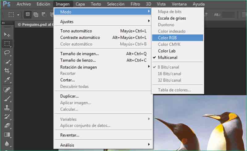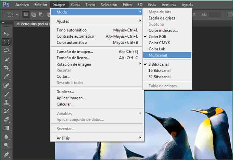 Las imágenes Multicanal contienen 256 niveles de gris en cada canal, por lo que se utilizan en impresión especializada. Debe tener en cuenta que el color indexado y las imágenes de 32 bits no pueden convertirse a este modo.