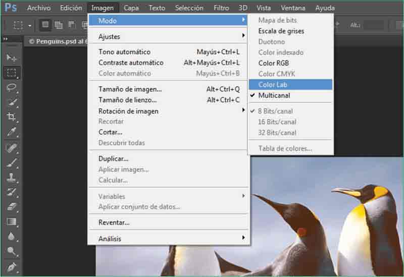 9 Observe sobre la imagen que el modo Multicanal realza los canales cálidos. (7) Seguidamente, seleccionaremos un modo de color distinto. Despliegue nuevamente el menú Imagen, pulse sobre el comando Modo y seleccione el modo Color lab. (8)