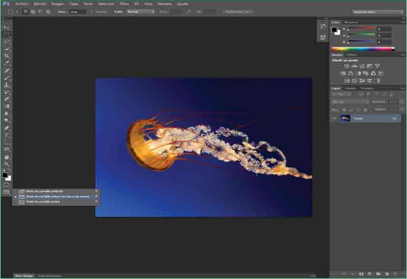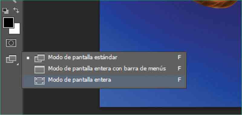 5 El modo de pantalla entera oculta toda la interfaz de Photoshop para mostrar sólo la imagen y, en el caso de que se encuentren activadas, las reglas horizontal y vertical. (3) Para volver al modo de pantalla normal, pulse la tecla Escape.