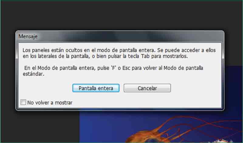 4 Un cuadro de diálogo nos informa de que el modo de pantalla entera oculta todos los paneles, y le sugiere el modo de volver a visualizarlo. Según se indica, es posible recuperar los paneles de Photoshop situando el puntero del ratón sobre el espacio que ocupan normalmente, así como pulsando la tecla Tabulador. En este caso, pulse el botón Pantalla entera para cambiar el modo de visualización de la imagen. (2)