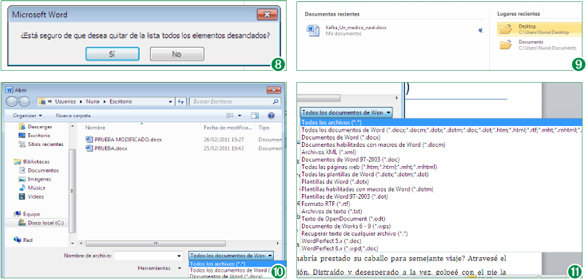 13 Efectivamente, sólo permanece en la lista el documento Kafka_Un_medico_rural.docx. Los otros han desaparecido incluso del panel de opciones de la pestaña Archivo. Por otra parte, hemos visto que puede abrir un documento usando su menú contextual en la vista Recientes. Recuerde que con sólo hacer un sobre clic sobre el nombre de un documento este se abre al momento. ¿Y qué sucede si hace clic en el nombre de alguno de los lugares donde estos están guardados? Vamos a averiguarlo ahora. Pulse sobre el primer elemento de la lista de Lugares recientes, en nuestro caso el Escritorio. (9)