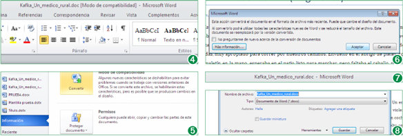 9 Como verá, la aplicación abre el cuadro Guardar como y da por sentado que el documento será guardado en el formato correspondiente a la versión actual. (8) Como ya disponemos del documento con la extensión .docx, no nos hace falta guardar el documento convertido, así que cancele el proceso para cerrar el cuadro.