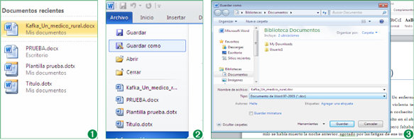 1 En el ejercicio que proponemos a continuación, aprenderá a guardar un documento creado en Word 2010 de manera tal que los usuarios que no disponen de la última versión del procesador de textos puedan igualmente abrirlo, y más adelante aprenderemos también a trabajar sobre un documento guardado en formatos anteriores y a convertirlo al formato XML. Ahora, para empezar, despliegue el contenido de la pestaña Archivo, que se abre directamente en la vista Reciente, y seleccione el documento Kafka_Un_médico_rural.docx con el que hemos trabajado en lecciones anteriores. (1)