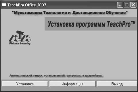 Чтобы установить мультимедийный курс «Office 2007», вставьте прилагаемый диск в привод вашего персонального компьютера. Затем откройте любым известным вам способом содержимое компакт-диска, найдите и запустите файл teachrun.exe. Появится окно установки (рис. 01).
