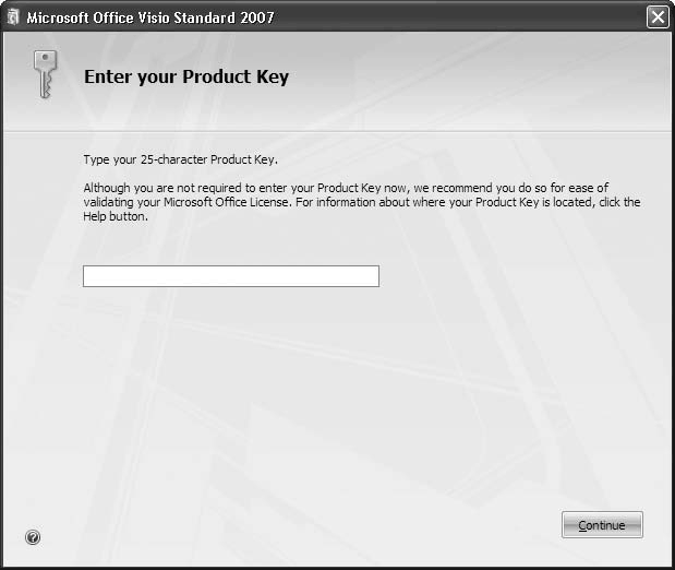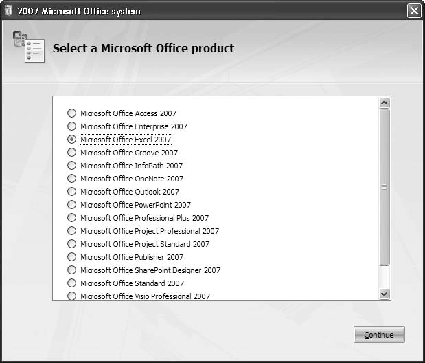 В данном окне с помощью переключателя выберите приложение пакета Office 2007, которое вы хотите установить на компьютер, и нажмите кнопку Continue. После этого откроется следующее окно программы установки (рис. 1.2).