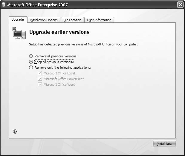 Если на вашем компьютере установлена предыдущая версия данного приложения Office, то в этом окне на вкладке Upgrade с помощью переключателя вы можете выбрать вариант установки: обновление имеющейся версии до 2007 (верхнее и нижнее положения переключателя) или отдельная установка версии 2007 независимо от предыдущей версии (положение Keep all previous versions).