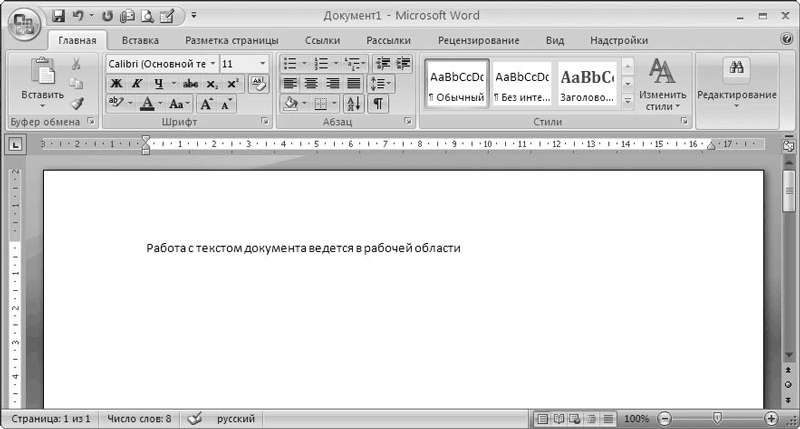 Рабочий интерфейс Word 2007, предлагаемый по умолчанию, показан на рис. 2.1.