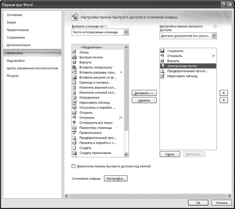 Чтобы перейти в режим более тонкой настройки, выполните команду Другие команды. В результате откроется окно (рис. 2.3), в котором вы можете самостоятельно выбрать команды (кнопки), которые следует включить в Панель быстрого доступа.