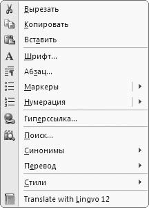 Содержимое контекстного меню Word 2007, которое вызывается щелчком правой кнопкой мыши, определяется текущим режимом работы. В частности, при работе с текстом оно содержит одни команды, с графическими объектами – совсем другие, с диаграммами – третьи и т. д. Мы рассмотрим только те команды, которые предназначены для работы с текстом (рис. 2.4), поскольку они наиболее востребованны.