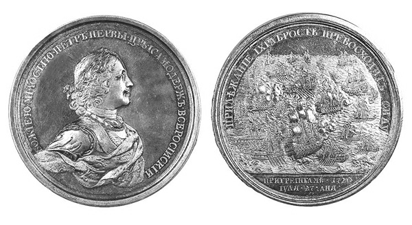 Медаль за битву при Гренгаме. «Прилежание и храбрость превосходит силу». 1720