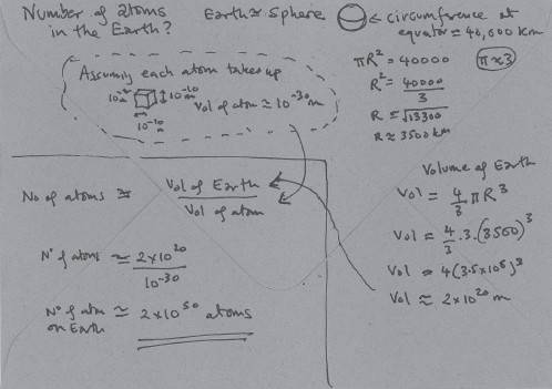 Расчет общего числа атомов на Земле, сделанный мною на оборотной стороне конверта. Результат (с точностью до порядка величины) – 200 000 000 000 000 000 000 000 000 000 000 000 000 000 000 000 000