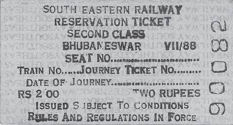 Билет до Бхубанешвара, куда я отправился во время моего путешествия по Индии в 1989 году с Эммой Вестлейк и Джеки Хит