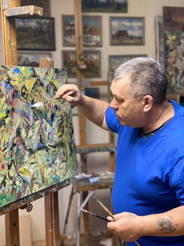 Предпочитает универсальный подход в живописи, то есть стилевое разнообразие, что и подчеркнуто в названии данной выставки Березайка, в окрестностях которой пишет традиционные этюды, и авангард, посредством которого пытается найти свое видение и выражение свободного современного художника, с любовью погруженного в провинциальное пространство милой сердцу средней полосы, желая, чтобы это своеобразное (авангардно-символистское), непонятное на первый взгляд, искусство, тоже имело место здесь – в глубокой дали от Центров мировой передовой, иногда даже очень передовой, изобразительной мысли.