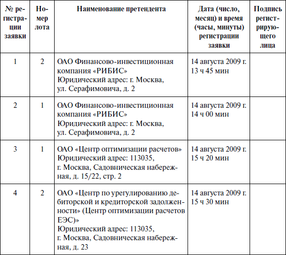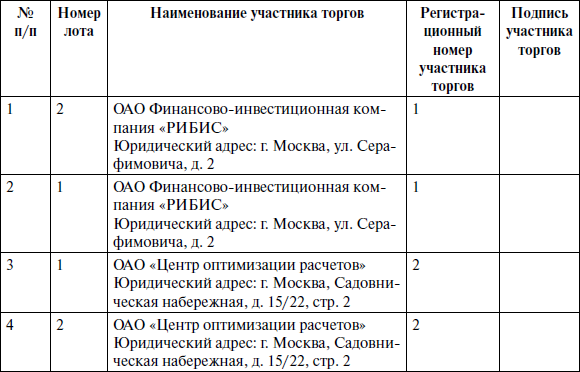 журнал регистрации участников торгов – журнал, в котором в день проведения торгов указывается наименование и регистрационный номер участника торгов;