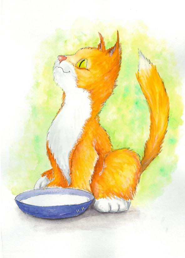 Принесла в дом бабушка рыжего котёнка,Положила бабушка котёнка на пелёнку,Молока налили в голубую миску,Пригласила кушать маленькую киску.Ушастый проказник в кухню поспешил,Опрокинул миску, молоко разлил.Бабушка вздыхает, качает головой,Говорит котёнку: «Ты очень озорной!»