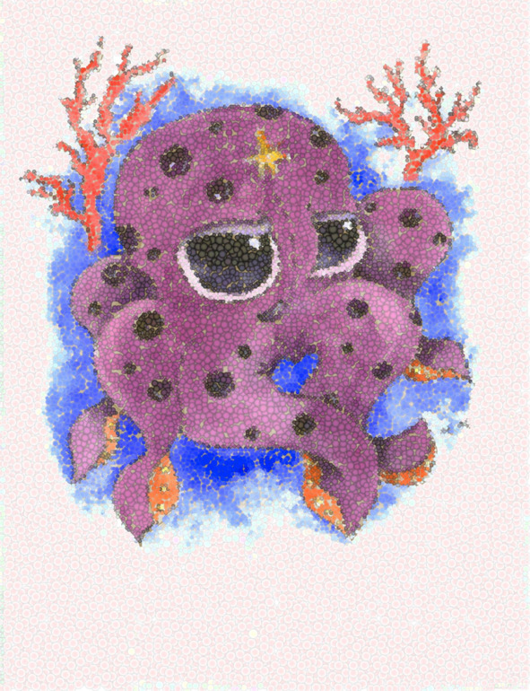 В толще тёмно-синий океан, в обломках затонувшего корабля, живёт маленький осьминожка. Его мягкое, круглое тельце заканчивается длинными, подвижными щупальцами с маленькими присосками. Осьминожку зовут Пятнышко, за отчетливо видимое, радужное пятнышко в форме звездочки на ярко-малиновом тельце.
