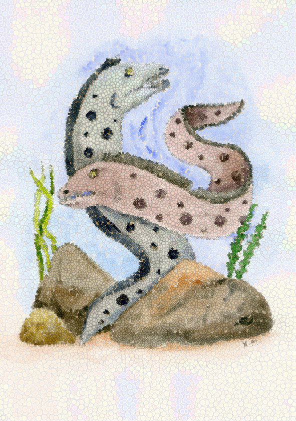 Осьминожка последовал за медузой, но внезапно увидел на дне, среди камней присыпанный песком небольшой, но ещё крепкий бочонок. Пятнышко рванул вниз и с силой выдернул его из песка. Держа неожиданную находку в щупальцах над головой, с криком: « Посторонись!», бросился на мурен. Бочонок оказался тяжелее, чем с первого взгляда мог предположить осьминожка. Он только хотел припугнуть задир, но не удержал бочонок, и тот полетел вниз. Ударившись об камень, старая бочка разлетелась в щепки, выбросив в воду облако мелкого, тёмного порошка. Мурены громко зачихали. Это оказался чёрный перец. Видимо бочка вывалилась с корабля во время шторма много лет назад, и всё это время пролежавший на дне. Малыши успели отплыть на безопасное расстояние, чтобы ни попасть в чёрную дымку. А мурены продолжали хрипло чихать. Едкие слёзы брызнули из покрасневших глаз. Пятна на гладких телах съёжились и потемнели. Дым взревел и метнулся в сторону от медленно оседающего едкого облака. Остальные последовали за ним. Отплыв на приличное расстояние, забияки остановились. Продолжая чихать и кашлять, мурены продолжали всматриваться в толщу воды, выискивая малышей.