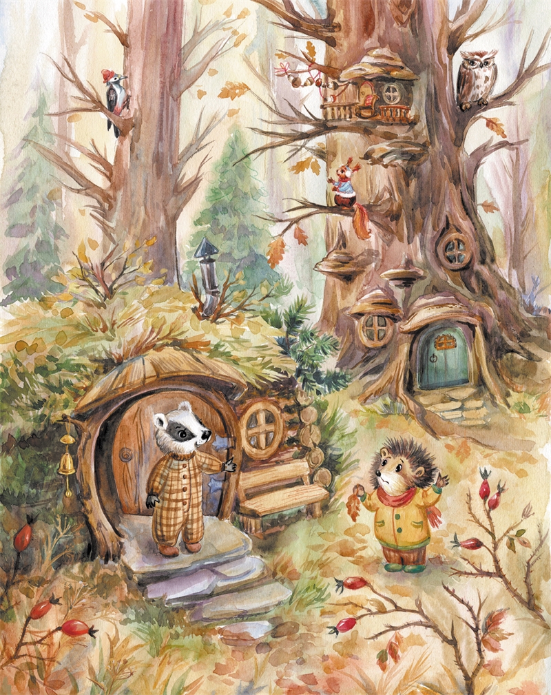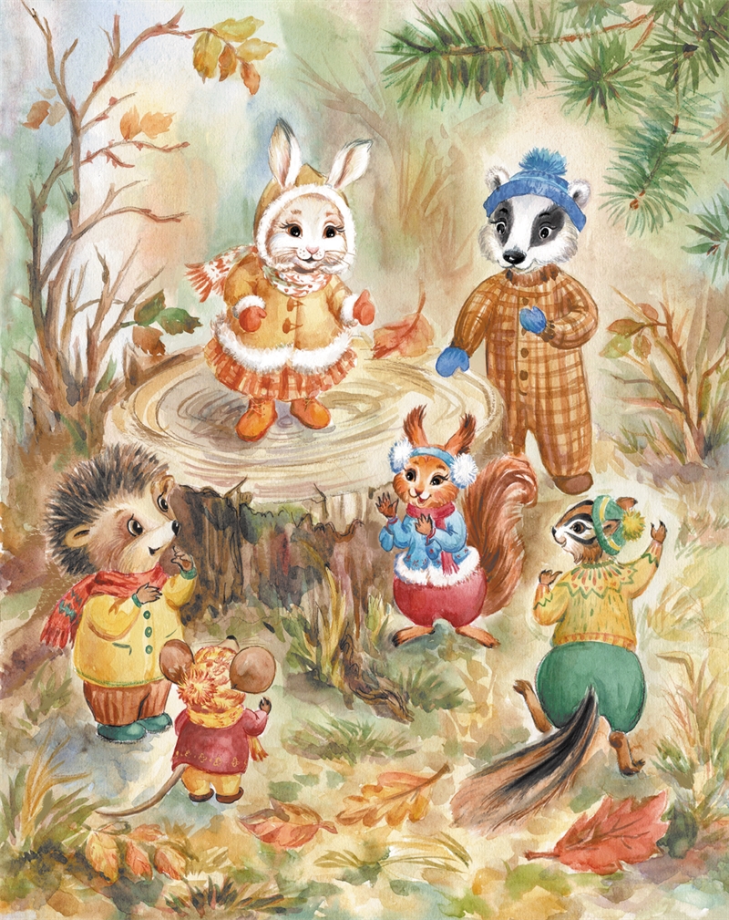 Зайка Лёля, белочка Зося, мышка Соня, ёжик Сеня, бурундучок Феня и маленький барсук Боря неизменно пекли праздничный пирог и готовили украшения. В новогоднюю ночь все собирались на лесной поляне за большим деревянным столом, чтобы обменяться подарками и вместе поприветствовать приходящий год.