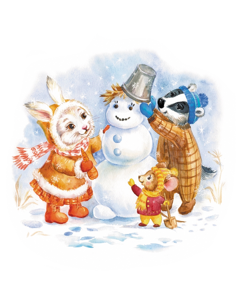 Целый день зверята играли в снежки, катались с маленьких горок на санках и даже слепили большого снеговика. Зайка Лёля вынесла морковку и сказала снеговику: