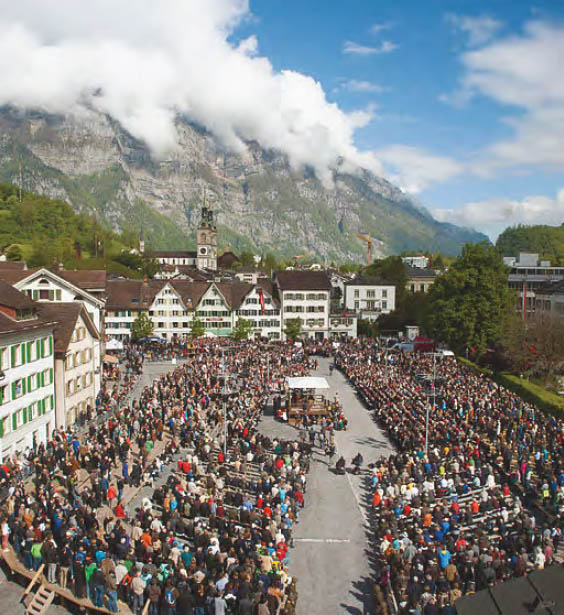 In der Schweiz waren solche öffentlichen Versammlungen, die »Landsgemeinden« (siehe Abb. 1) oder auch Zendenversammlungen (Bezirksversammlungen im Wallis), noch im 17. und 18. Jahrhundert eine »funktionsfähige Form der Öffentlichkeit des Politischen« (WÜRGLER 1996: 33, Hervorh. d. Verf.; vgl. auch CARLEN 1973: 24; MÖCKLI 1987: 26-30).17 In einem Kanton, Glarus, sowie einem Halbkanton, Appenzell Innerrhoden, hat sich diese Tradition – selbstverständlich mit starken Veränderungen – bis heute erhalten: Einmal im Jahr18 versammeln sich alle Stimmfähigen, um »unter freiem Himmel über alle wichtigen politischen Geschäfte« zu beraten und zu entscheiden (BLUM/KÖHLER 2006: 285).19 Entschieden wird dabei etwa über Verfassungsänderungen, Gesetze, Kreditbeschlüsse sowie Verträge, in Glarus auch über den Steuersatz, wobei auch Vorlagen abgeändert werden können. »Die Versammlung als höchstes Organ existiert überdies in einigen schwyzerischen Bezirken, in der Mehrzahl der bündnerischen Kreise und in rund 2000 Gemeinden« der Schweiz (ebd.). Insbesondere in kleineren Gemeinden stellt die Gemeindeversammlung, bestehend aus allen stimmberechtigten Einwohner*innen, noch recht häufig das Legislativorgan dar, größere haben heute meist ein Gemeindeparlament (vgl. ebd.). Bei den beiden noch bestehenden Landsgemeinden finden allerdings »lebhafte verbale Kontroversen« zwischen den Bürger*innen, wie sie früher häufig der Fall waren (WÜRGLER 1996: 34), nur noch selten statt, werden doch die anstehenden Fragen vorher bereits ausführlich in den Massenmedien diskutiert (vgl. BLUM/KÖHLER 2006: 296f., 302). Dagegen enthielten die frühen Zeitungen, im 17. und auch noch 18. Jahrhundert, meist keine oder kaum lokale Berichte, sodass für die anstehenden Entscheidungen bei den Landsgemeinden noch großer Diskussionsbedarf bestand, »ja etliche strittige Probleme sind überhaupt erst durch Anträge aus dem Kreis der gemeinen Landleute thematisiert worden« (WÜRGLER 1996: 34). Außer in den erwähnten Landsgemeinden und Gemeindeversammlungen findet Versammlungskommunikation selbstverständlich, nicht nur in der Schweiz, auch heutzutage immer noch vielerorts statt, insbesondere im Rahmen kleinerer Teilöffentlichkeiten, so etwa in Parlamenten, Vereinsversammlungen etc. Sie dient aber meist nicht mehr dem gesamtgesellschaftlichen Austausch, der heute vorwiegend über die Massenmedien zustande kommt.