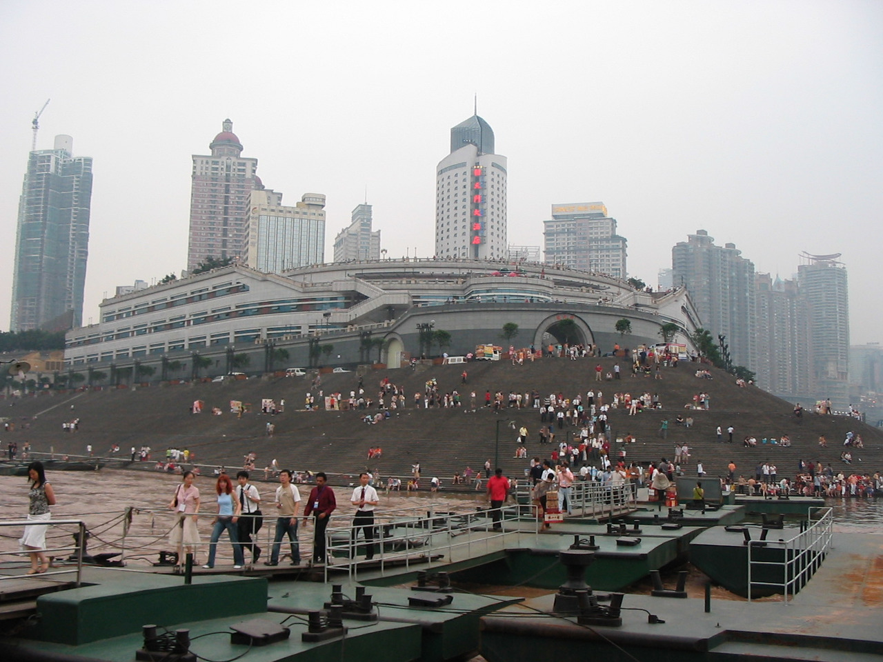 О круизе расскажу подробнее. Исторически сложилось так, что главный культурный и деловой центр Чунцина расположен в месте слияния рек Янцзы и Цзялин. Место действительно очень живописное, там же находятся многочисленные пирсы для прогулочных теплоходов, ожидающих туристов. Наиболее интересен круиз по обеим рекам в вечернее время, когда окружающие небоскребы расцвечиваются разноцветными огнями реклам, и на набережной начинается лазерное шоу.