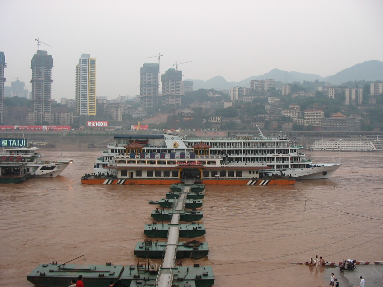 Обычный круиз состоит из трех частей: первая, статичная, когда теплоход еще стоит у причала, а пассажиры, особенно китайского происхождения, массово набрасываются на еду, предлагаемую в форме китайско-шведского стола, то есть блюда китайские, а форма подачи – шведская; вторая, когда теплоход около часа плывет по Янцзы и третья, когда судно возвращается к месту слияния обеих рек и уходит в Цзялин, также примерно на час. Для того, чтобы попасть на теплоход, необходимо было пройти по цепочке из узких понтонов, скрепленных между собой и с берегом стальными тросами. В начале лета уровень воды в Янцзы высокий и под яростным напором реки понтоны так устрашающе скрипели и раскачивались, что идти по ним было довольно неуютно.