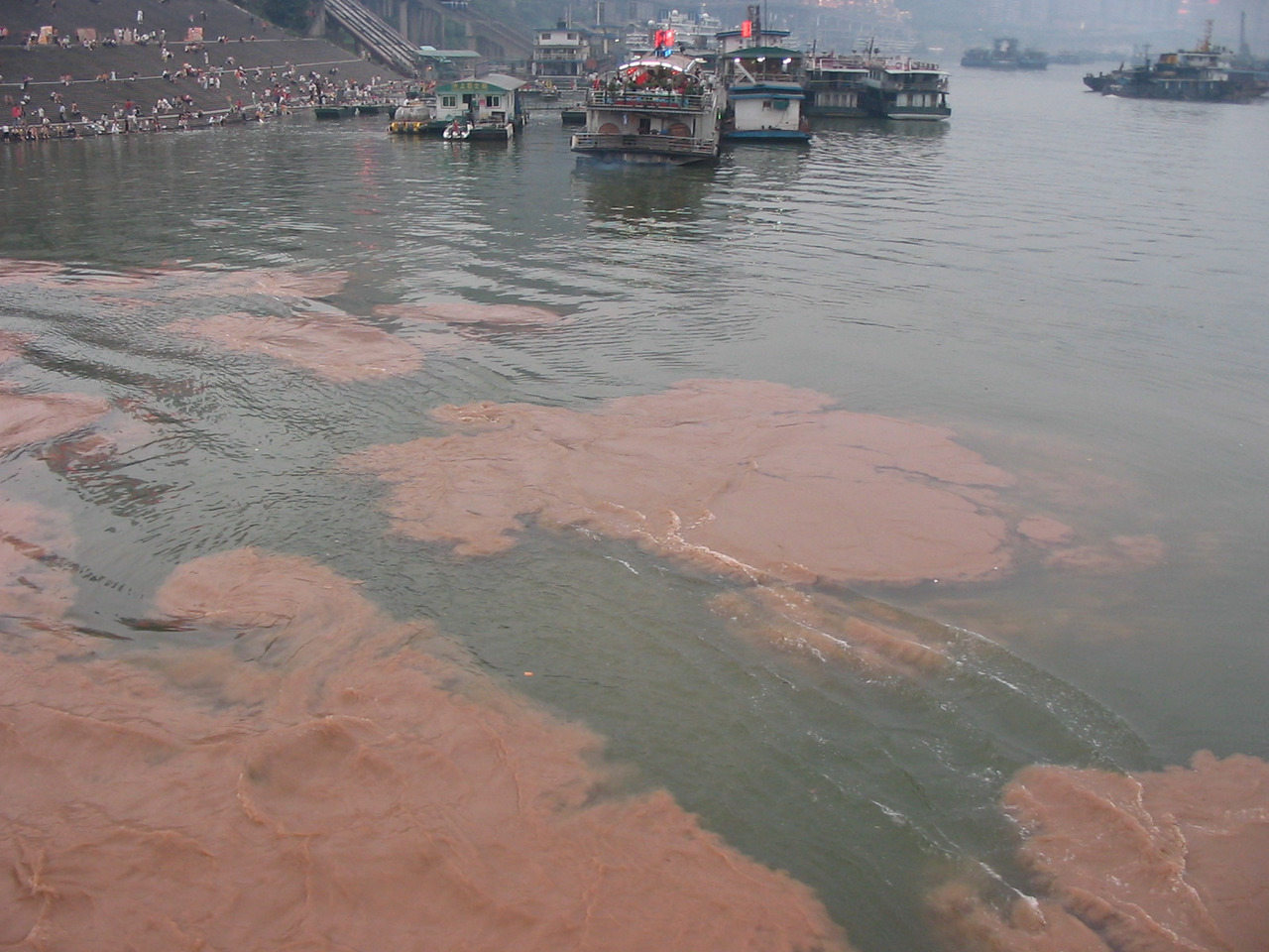 Вообще, место слияния двух столь разных и больших рек очень интересно. Вода в Янцзы имеет, как правило, светло-коричневый оттенок и совершенно непрозрачна, тогда как в Цзялин она серо-голубая. После того как обе реки встречаются, наблюдается интересное явление – по воде, увлекаемые быстрым течением, несутся гигантские охряные кляксы. Это, как оказалось, маленькие озерца воды из Янцзы. Ниже по течению, вода, перемешиваясь, становится одного, грязно-бурого цвета и остается таковой до самого Восточно-Китайского моря. Справедливости ради следует отметить, что в зимний период, когда уровень воды в обеих реках заметно падает, вода в Янцзы несколько очищается и становится более прозрачной.