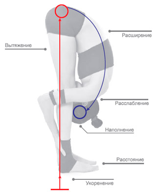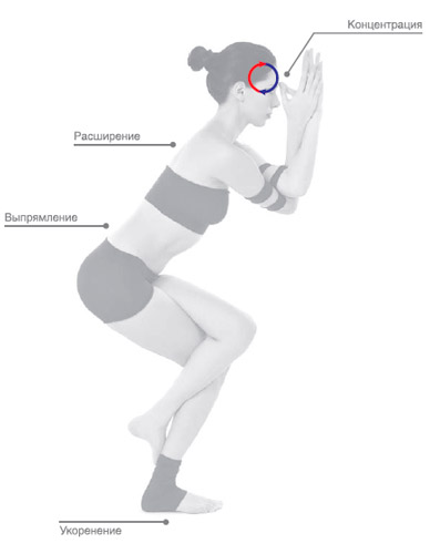 Заземление стопы; вытяжение корпуса вверх, в Небо; расширение тазобедренных суставов и растяжение паховой области в горизонтальной плоскости.