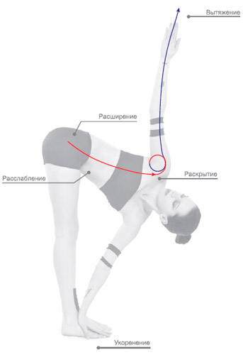 Укоренение стоп; расслабление живота, скручивание и раскрытие плечевого сустава верхней руки на выдохе; вытяжение верхней руки вверх; укоренение стоп и нижней руки (на стопе).