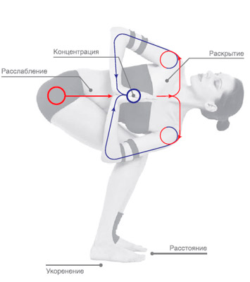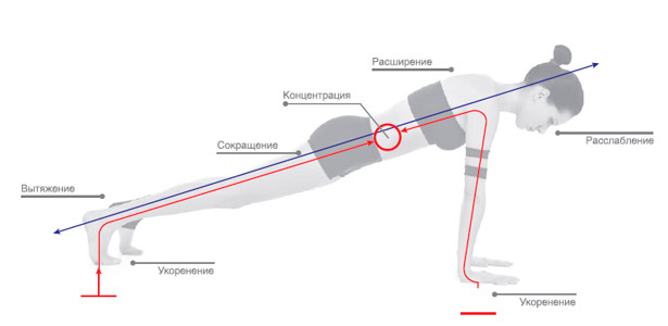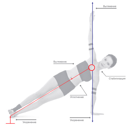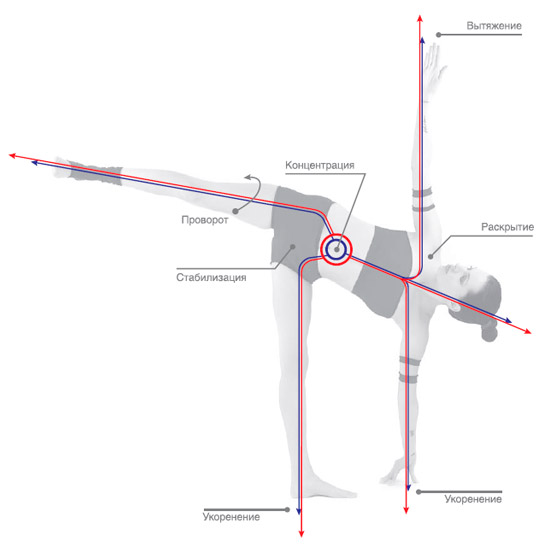 Центр тела; вытяжение из центра в четырех направлениях; стабилизация таза; укоренение опорной ноги и нижней руки.