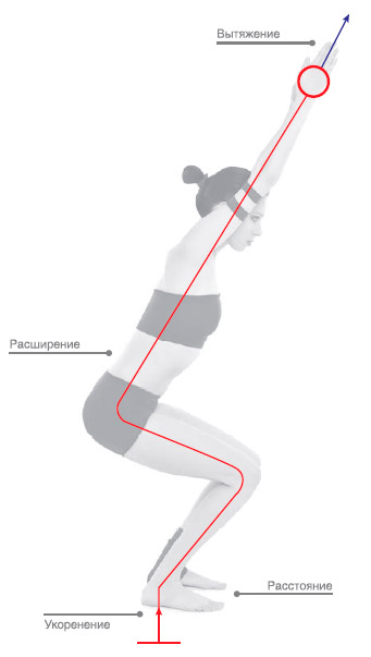 Весь объем тела; укоренение стоп в Землю; вытяжение позвоночника и рук по диагонали вверх.