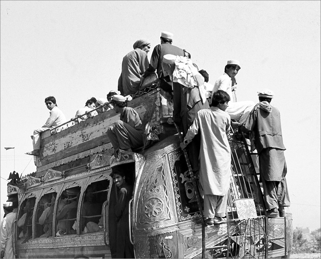 La continua llegada de refugiados en un goteo humano constante, sumado al permanente trasiego de guerrilleros, que partían o regresaban, convirtió la zona fronteriza en un lugar de difícil descripción. Nómadas que viajan a paso lento por el borde de la carretera dirigiendo una larga fila de camellos y viajeros que se desplazan a lomo de un perezoso buey con todas sus pertenencias haciendo gala de una paciencia infinita, son características que definen a los que huyen sin un espacio para el retorno y que han perdido el rumbo y la noción del tiempo. Los medios de transporte convencionales abarrotados y totalmente insuficientes castigan en forma ininterrumpida con la estridente bocina y surgen las preguntas: ¿por qué?; ¿para qué? No hay respuestas, pero una cosa es cierta: sin la tortura de la bocina, la zona ya no sería la misma. Pasajeros que viajan agazapados sobre los techos de los coloridos y pintorescos autobuses en un alarde de malabarismo perpetuo, sumados a las siempre atractivas tanga —carros tirados por caballos—, bicicletas, cientos de peatones y el llamativo rickshaw, especie de motocarro multicolor que hace las veces de taxi; para mareo del visitante se mezclan vehículos, si de Afganistán con el volante a la izquierda, de Pakistán a la derecha por lo que los pakistaníes por la influencia británica se empeñan en conducir al revés, vendedores que ofrecen a gritos en plena calle el humeante chole —guiso de garbanzos— completan el espectacular, variopinto y, algunas veces, dramático panorama de una ciudad que florece a las puertas de la guerra. Algo tan románticamente bello de la época británica como el Deam’s Hotel llamaba la atención de los visitantes aunque la voracidad de la especulación inmobiliaria acabara con él. Al hospedarse en tan singular hotel el huésped se trasladaba a un espacio perdido en el tiempo.