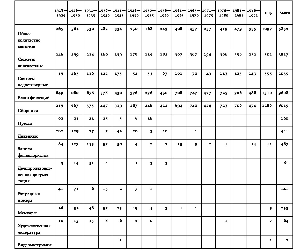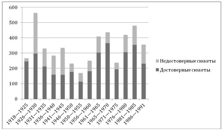 Проанализировав каждый из выделенных сюжетов, мы по самой ранней фиксации или по датировке, выставленной автором источника, сумели выявить приблизительное время появления или актуализации для 4755 сюжетов. Для удобства представления данных о хронологии развития сюжетного фонда мы распределили сюжеты на 14 отрезков примерно по пять лет. Эти хронологически периоды не равны – мы вынуждены были использовать в качестве «пятилеток» бóльшие временные отрезки (1918—1925 и 1985—1991 года). Условность этого деления может быть оправдана общим уровнем условности хронологической локализации значительной части материала, точность датировки которого колеблется от одного дня до промежутка в несколько лет, что не позволяет использовать более конкретную шкалу. Картина хронологического развития сюжетного фонда получилась такой (см. график).