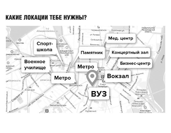 Мы расписали самые основные пункты, по которым ты должен выбирать локацию. Наверняка ты что-то знал сам или догадывался. Что с этим делать? Тебе нужно промониторить места в твоем городе с максимальной концентрацией перечисленных «магнитов». Чтобы квартира была нужна максимальному количеству клиентов. Составь мини-карту и ищи квартиру в пределах подходящей локации.