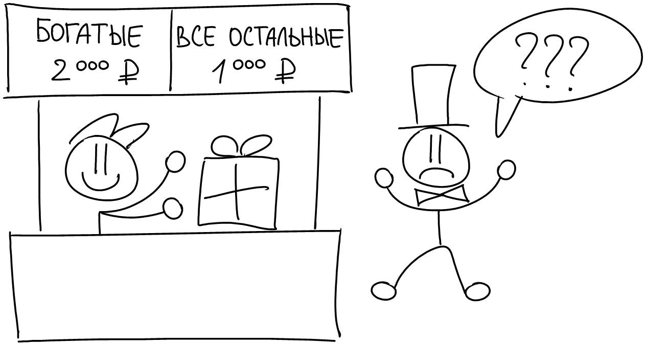 Что же делать? По-видимому, разные покупатели готовы платить за продукт разную цену. Хорошо бы иметь несколько цен на продукт, не так ли? Процесс, когда на один и тот же продукт устанавливается несколько сцен, называется ценовой дискриминацией. Ценовая дискриминация, к большому сожалению, в большинстве случаев невозможна. Если бы она была доступна везде и всюду, то приходя в магазин мы бы могли столкнуться вот с такой ситуацией. На витрине было бы два ценника: на одном было бы написано, что цена для богатых 2000 руб., а на другом – предложение для всех остальных с ценой в 1000 руб.