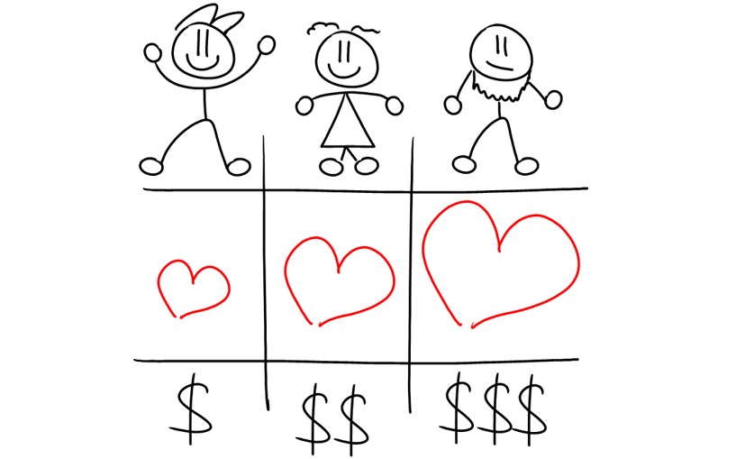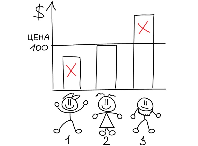 Мы уже определили нашего основного покупателя и выбрали цель, которой хотим достигнуть. Казалось бы, самое время заняться поиском оптимальной цены, той самой, при которой прибыль будет максимальной. Давайте себе представим ситуацию, что вам с помощью различных анализов и тестов удалось определить оптимальную цену на свой продукт, например 100 долларов. Вы выставляете продукт на полку и ждете ошеломляющих продаж. К вам в магазин приходят несколько покупателей. Нужно заметить, что у каждого из них свои предпочтения, вкусы, потребности и покупательская способность, выраженная размером кошелька (или остатком на банковском счете). На рисунке ниже как раз приведен пример трех таких покупателей.