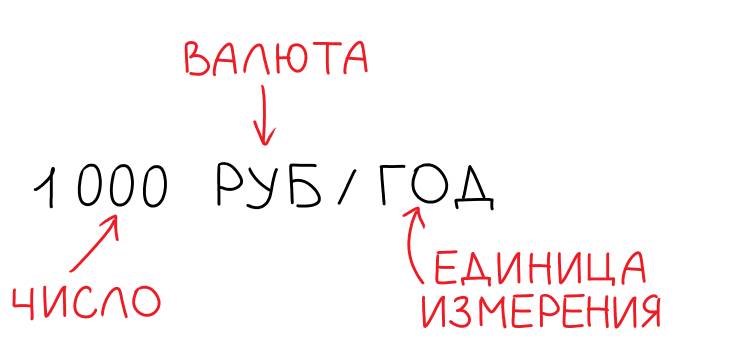 Представьте себе обычный ценник на товар, например, на антивирус для компьютера, на котором написано 1000 рублей / год. Цена в данном случае, это не только число 1 000, на самом деле она состоит из трёх компонентов: