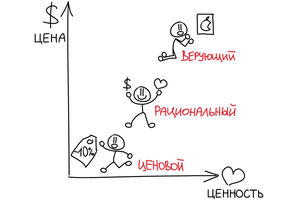 • «Ценовой» – это покупатель, который ищет выгодную покупку. Для него особо не важна ценность продукта, качество и совсем уж лишним будет премиальный статус. Он ищет самую низкую цену и за скидку или чувство выгодной покупки готов отдать все. Конечно, данное описание гиперболизировано, но таких покупателей довольно много.