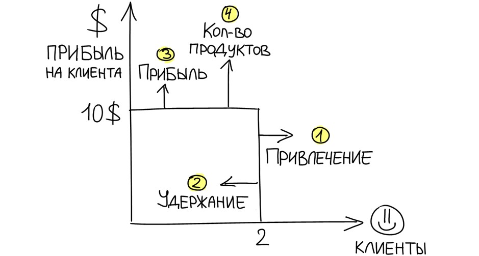 В выборе правильного курса вам может помочь подход, изображенный на рисунке ниже. В его основе лежат два основных пути увеличения прибыли: 1. увеличение количества клиентов (горизонтальная ось) и 2. увеличение прибыли (среднего чека) на клиента (вертикальная ось). Например, в компании два клиента и на каждом нам удалось заработать по 10 $. Общий доход компании 20 $ (на рисунке соответствует площади прямоугольника).