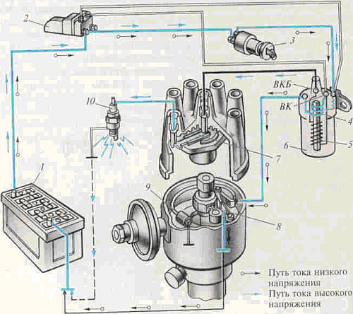 Рис. Схема контактной системы зажигания 1 – аккумуляторная батарея, 2 – включатель стартера, 3 – включатель зажигания, 4 – первичная обмотка, 5 – вторичная обмотка, 6 – катушка зажигания, 7 – распределитель, 8 – прерыватель, 9 – конденсатор, 10 – искровая свеча зажигания, ВК – выводная клемма от первичной обмотки, ВКБ – выводная клемма от батареи.