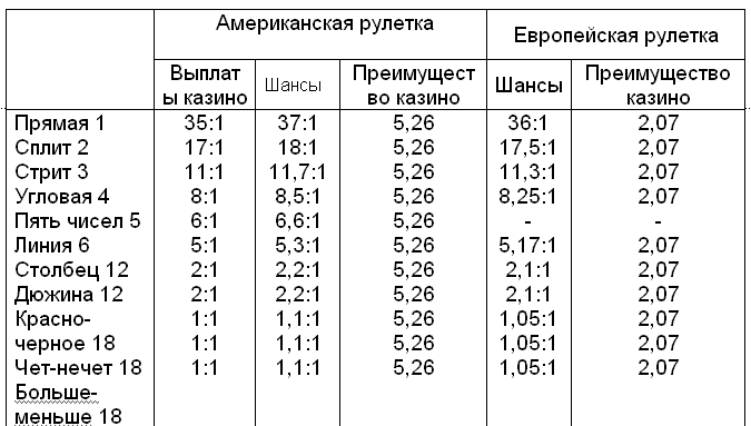 Обычно казино имеет преимущество перед игроком, так как выплата по выигравшим ставкам меньше истинной вероятности выигрыша по данной ставке. Это хорошо видно из приведенной таблицы.
